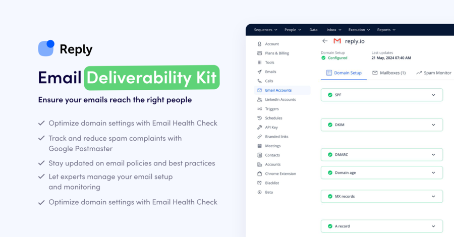 - Email Deliverability Suite → Keep emails out of spam with built-in warm-up, health checks, SPF/DKIM/DMARC monitoring, and more.